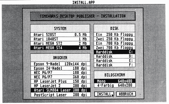 Die Anforderungen, die Timeworks an die Gerätekonfiguration des künftigen Benutzers stellt, sind an sich gering; sogar auf einem 520 ST läuft der Publisher, allerdings muß wegen der Größe des Programmes eine Festplatte unbedingt empfohlen werden, schon allein deshalb, weil sehr viele Dateien geladen werden müssen, was doch immer einige Zeit beansprucht. Außerdem werden ständig Dateien von Diskette nachgeladen. Mit einem Disklaufwerk zu arbeiten, ist so gut wie unmöglich.