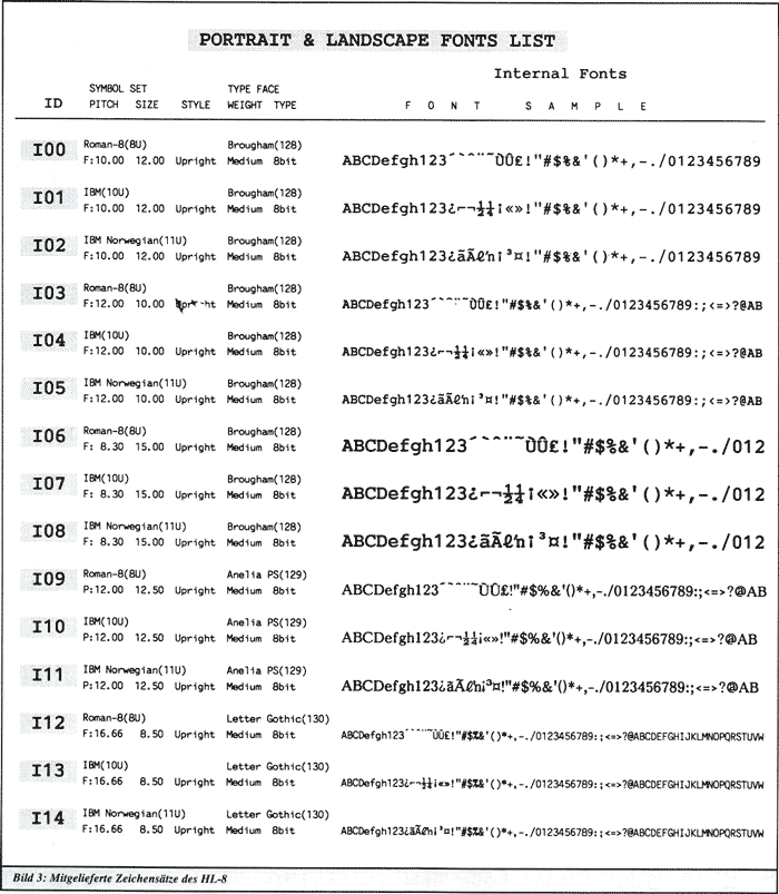 Der Drucker enthĂ€lt keine ausgefallenen Schrifttypen; es sind gleichwohl verschiedene proportionale und nichtproportionale Fonts vorhanden, im wesentlichen zwei Grundtypen, wie im Bild zu sehen. Dabei stehen jeweils die IBM- und Epson-ZeichensĂ€tze zur VerfĂŒgung, erstere in den diversen nationalen Versionen. SelbstverstĂ€ndlich sind auch Schriftarten wie kursiv, fett und unterstrichen vorhanden, jeweils, wie es die aktuelle Druckeremulation verlangt. Das gleiche gilt fĂŒr Download-Fonts.