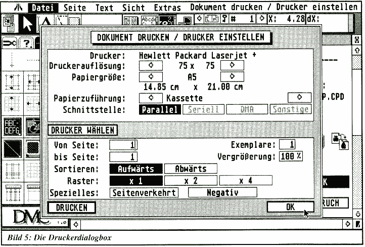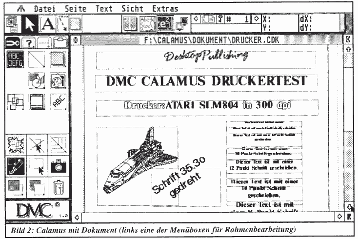 Im Augenblick unterstützt Calamus eine ganze Reihe von Druckern: zum Beispiel Epson FX-80, NEC P6/7, ATARI Laser, HP Laserjet+. Außerdem ist in Kürze eine Hardware-Lösung verfügbar, die den Anschluß an einen Linotronic Laser-Belichter möglich macht. Dies dürfte allerdings um die 2.500,-DM kosten. Die Druckereinstellbox bietet einige nützliche Optionen wie Vergrößerung, Druckreihenfolge, seitenverkehrten oder negativen Druck und Vergröberung des Druckrasters für Füllmuster. Letzteres verhindert oft zu schwarze Füllmuster oder Raster bei ungleichmäßiger Kontrastverteilung des Druckers.
