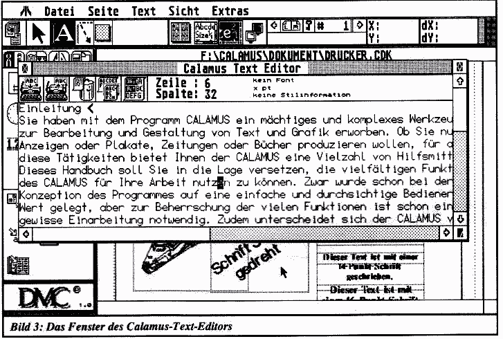Außerdem hat man aus den Schwächen diverser Konkurrenzprodukte gelernt und einen eigenen schnellen Texteditor integriert, der es auch möglich macht, Text direkt in Calamus zu erfassen. Ein guter Teil der Calamus-Funktionen steht auch im Editor, der sich übrigens komplett in einem Fenster befindet, zur Verfügung. Das Fensterprinzip hat beim Texteditor den großen Vorteil, daß man nicht unbedingt zwischen Layout und Editor umschalten muß, sondern, in gewissen Grenzen, mit beiden parallel arbeiten kann. So richtig zum Tragen kommt dieser Vorteil allerdings nur auf einem 19"-Großbildschirm, wie der Verfasser voller Begeisterung feststellen konnte, nachdem ein solches Wundergerät zwecks Test auf seinen Schreibtisch verschlagen wurde. An dieser Stelle daher gleich der Hinweis: Wer sich ernsthaft oder halbernsthaft mit DTP beschäftigen will, für den ist ein Ganzseitenmonitor ein absolutes Muß. Aber zurück zum Editor, das Modul ist schnell und gibt den Text gut lesbar wieder, da glücklicherweise nicht der ATARI-Zeichensatz verwendet wird. Steuerzeichen für Schriftart, Schriftgröße usw. werden als fettgeschriebene Steuerzeichen (wahlweise im Klartext!) per Mausklick in den Text eingefügt, der Text wird immer im Flattersatz dargestellt. Wie häufig man den Editor benutzen wird, hängt, wie ich glaube, stark von der persönlichen Arbeitsweise ab; ich persönlich würde längere Texte lieber mit Tempus eingeben. Aber das ist, wie gesagt, nur Geschmacksache.
