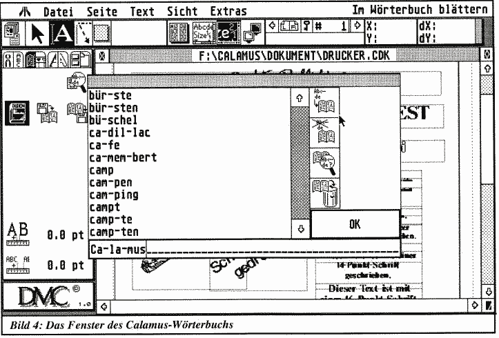 Calamus ist inzwischen bei Version 1.01 angelangt- die sich von der 1.0-Version durch beseitigte Fehler unterscheidet. Die' i>t höchst erfreulich, begeisterte doch die 1,0-Version durch ihre Fähigkeit zu spektakulären Abstürzen (Sie trieb mich beinahe zur Verzweiflung...). Nun, die 1.01-Fassung ist erheblich sicherer. Sie stürzt zwar immer noch ab, aber bei weitem nicht mehr so oft. Die Trennhilfe (bzw. das Wörterbuch) ist allerdings immer noch anfällig. Mit der 1.01-Version kann man wohl arbeiten.