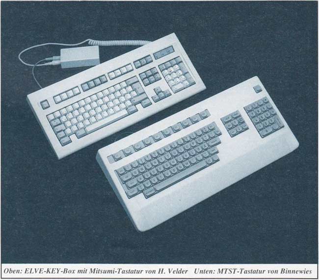 Da an dieser Box alle IBM-Kompatiblen Tastaturen anzuschließen sein sollen, diese sich aber wenigstens bei einem Reset oder beim Einschalten des Rechners an keinen erkennbaren Standard halten, ist die korrekte Verarbeitung der ankommenden Daten eine aufwendige Angelegenheit. Wie mir Herr Velder telefonisch mitteilte, ist es ihm nach erheblichen Schwierigkeiten gelungen, seine Box an alle ihm bekannten Tastaturen anzupassen. Sollten Sie also Ihre AT-Tastatur, die Sie schon zu Hause rumliegen haben, benutzen wollen, kann eine Nachfrage, ob sie mit der ELVE KEY-Box (so ist ihr voller Name) zusammenarbeitet, nicht schaden.