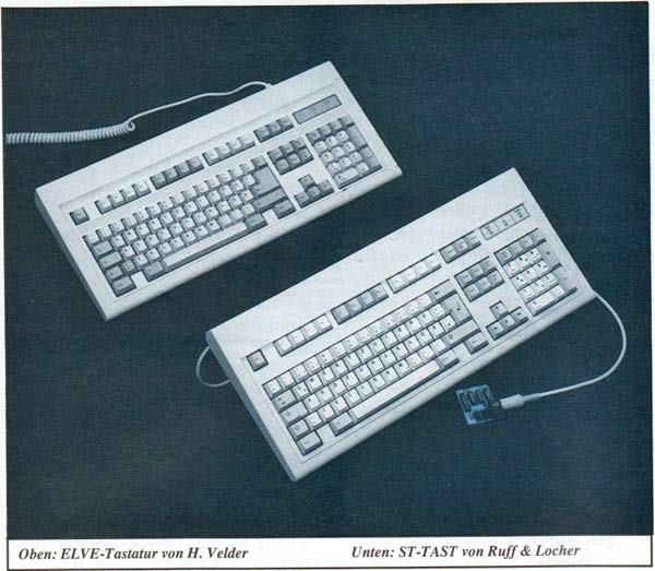 Die letzte hier vorgestellte Lösung ist ST-TAST der Firma Ruff & Locher, die ebenfalls den Anschluß nicht umgerüsteter, IBM-kompatibler Tastaturen erlaubt. Der Anschluß erfolgt mittels einer sehr kleinen, offenen Platine, die in den ROM-Port gesteckt wird. Die beiden Originaltastaturen arbeiteten auch hier ohne Probleme, fast ohne. Der einzige Fehler, der mir auffiel. und das recht schmerzlich, war die falsche Belegung der Bindestrichtaste. Es ist zwar möglich, das Minuszeichen auf dem Zehnerblock zu benutzen, aber dem Schreibfluß bei meinen Zehnfingerschreibversuchen ist das nicht dienlich. Außerdem war die falsche Belegung nicht von Dauer, d.h. einmal lagen der Bindestrich und der Unterstrich richtig, das andere Mal, ohne Reset oder das Textprogramm verlassen zu haben, konnte mit dieser Taste nur noch der Schrägstrich erreicht werden (die Götter wissen warum). Ich kann nur wage vermuten, daß es mit dem ROM-Port zusammenhängt. Wie Sie vielleicht wissen, ist der ROM-Port nicht interruptfähig. Die an ihm angeschlossene Hardware kann also keinen Interrupt auslösen. Das Treiberprogramm muß sich in die VBL-Interruptliste einhängen und ständig den Port auf eingehende Daten abfragen, wobei es meiner Meinung nach zu Datenverlusten oder Verfälschungen kommen kann. Ich nehme allerdings an, das an einer Verbesserung des Treiberprogrammes, sofern es für den Fehler verantwortlich ist, gearbeitet wird. Ich persönlich boote lieber meinen Rechner weiterhin von der ROM-Disk, anstatt diesen Port mit einer Tastatur zu blockieren.