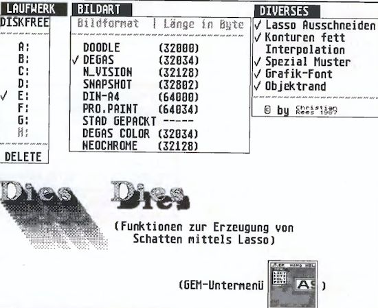 Das Interessanteste dürften wahrscheinlich die mitgelieferten Zeichensätze im GEM-Format sein. Hier stehen für jede Gelegenheit Fonts in beliebiger Größe zur Verfügung, auf der gelieferten Diskette befinden sich über 60 (sechzig!) verschiedene Zeichensätze. Sicherlich wurde deshalb besonderer Wert auf die Textfunktionen gelegt. Nicht nur ASCII-Dateien lassen sich in lesbare Grafiken umsetzen, der Text kann auch zentriert, im Blocksatz ausgegeben oder bei überstehenden Buchstaben (z.B. W,A,T usw.) ineinander geschoben werden (Kerning) und vieles mehr. Die zahlreichen Möglichkeiten der Textmanipulation bieten Hobby-Handbuchautoren, die Text und Grafik kombinieren müssen, ohne sich ein DTP-Programm zulegen zu wollen, genau die richtigen Funktionen. Durch Doppelklick können im Programm die meisten Parameter eingestellt werden (Füllmuster, Linienart usw.).