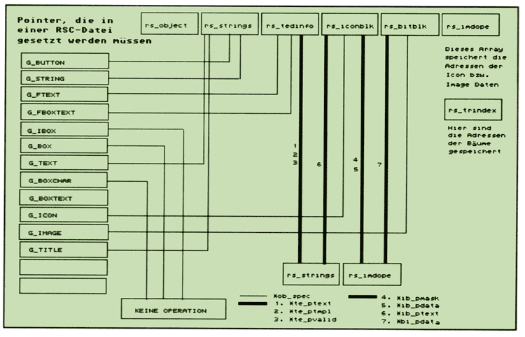 Es bleibt noch die Frage, wie man das Diagramm auf der vorherigen Seite benutzt: Nun. Sie suchen sich ein Objekt aus (z.B. G_ICON), gehen entlang der dünnen Linie - soll für ob_spec-Zeiger stehen - und stellen fest, daß der Zeiger ins RS_ICONBLK-Array zeigt. Jetzt gehen Sie nach unten und stellen fest, daß (6), also der IB_PTEXT-Zeiger, ins RS_STRINGS-Array zeigt und (4) und (5), also IB_PMASK- und IB_PDATA-Zeiger ins RS_IM_DOPE-Array zeigen müssen.