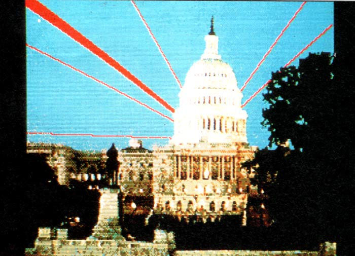 Damit kommen wir zum letzten Teil unseres Computerfilms, den Sie ebenfalls mit âSTR ladenâ oder âSTR zuladenâ komplett in den Filmeditor von DENISE einladen können. Die beiden Strukturen heiĂen âC_TEIL3.STRâ bzw. âM_TEIL3.STRâ. Hier zeigen wir Ihnen noch einige weitere Effekte aus IMAGIC, mit denen Sie Grafiken unterschiedlicher Art prĂ€sentieren können. Wenn Sie bis jetzt alle Schritte dieser Serie mitgemacht haben, brauchen Sie unsere Hilfe eigentlich nicht mehr, um die Anweisungen im Filmeditor zu verstehen und nach eigenen WĂŒnschen umzubauen... (Wissen Sie jetzt, wie die Laserstrahlen um das Capitol herum entstehen?)