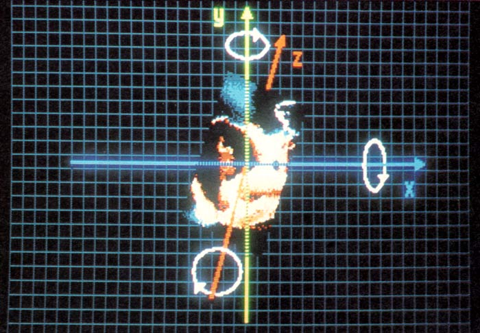 Die beiden anderen Raumachsen stehen senkrecht zu dieser Rotationsachse und verlaufen in der Ebene des Monitorbildes. Jede Rotation um eine dieser beiden Achsen bedeutet fĂŒr unsere Computergrafik eine einfache Verzerrung in horizontaler oder vertikaler Richtung, da die Grafik ja immer nur eine zweidimensionale Projektion auf den Bildschirm darstellt. Somit können wir durch Zusammenspiel von winkelgenauer Rotation, Spiegelung und stufenloser Zoomvorrichtung jeden gewĂŒnschten Dreheffekt im dreidimensionalen Raum erzielen.