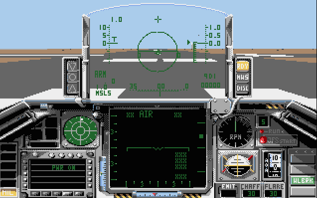 Im Cockpit findet man sich einer Vielzahl von Meßinstrumenten (künstlicher Horizont, Radar usw.) gegenüber. Es läßt sich eine vollständige Rundumsicht über Tasten erreichen. Lenken kann man entweder mit der Tastatur, der Maus cxier wie echte Piloten mit dem Knüppel, je nachdem, was man vorher durch das Menü angewählt hat.