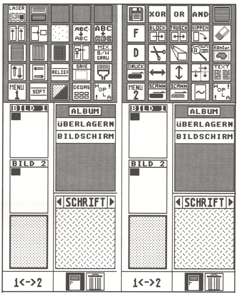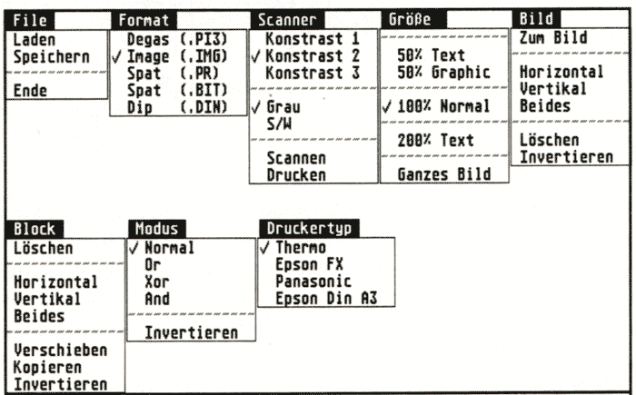 Zum Einladen und Abspeichern stehen insgesamt sieben verschiedene Dateiformate zur VerfĂŒgung: Degas (High), Degas (Low), Screen (32k), DIN A4 (64k), GEM-Image (IMG), Gesamtbild (463.088 Bytes) und PR-Format (Gesamtbild komprimiert). Im Textraum kann mit Systemfonts beliebiger Art und GröĂe in das Bild geschrieben werden. Eine schöne Sonderfunktion wurde eingebaut, die in erster Linie fĂŒr Ăberschriften eingesetzt werden kann: Der Benutzer zieht eine Box um seinen Text. An der Stelle, an die er mit der Maus klickt, wird punktweise der Text zusammengerĂŒckt oder auseinandergezogen. Leider kann die Funktion nicht als Kerning (Ăberlappen von ĂŒberstehenden Buchstaben, zum Beispiel T, A, W. usw.) benutzt werden. Schiebt der Benutzer seine Buchstaben nĂ€mlich so weit zusammen, daĂ sie sich ĂŒberlappen wĂŒrden, werden die Pixel eines Zeichens gelöscht. Die Funktion dient also nur zum Komprimieren breiter und Dehnen schmaler Texte. Mit einer weiteren Funktion lĂ€Ăt sich ein Randausgleich verwirklichen. Hier werden die Leerstellen zwischen den Wörtern so gedehnt, daĂ man eine Art Blocksatz erhĂ€lt. Die AbstĂ€nde zwischen den Buchstaben bleiben jedoch fest.