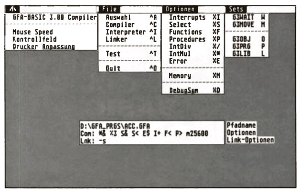 Bei „sauber programmierter“ Software wird die Vielzahl der einstellbaren Optionen gewöhnlich nicht verändert, wodurch sich nach kurzer Eingewöhnungsphase ganz vernünftig arbeiten läßt. Denn hat man im Menüprogramm (das bemerkenswerterweise als GFA-Sourcecode mitgeliefert wird und so jederzeit auf eigene Bedürfnisse umprogrammiert werden kann) erst mal alle Parameter eingestellt, so genügen gewöhnlich ein paar Knopfdrücke. Außerdem wurde bei der Version 3.0 strikt zwischen „Compilieren“ und „Linken“ getrennt, so daß sich auch Unterprozeduren aus verschiedenen Programmen „Zusammenhängen“ lassen. Ferner bietet die neue Version des Compilers auch die Möglichkeit. Accessories zu erstellen und Routinen aus „C“-Compilern in seine GFA-Programme einzubinden.