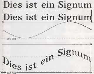 Bild 3: Texte und Bilder lassen sich beliebig an Linien anpassen. Oben vor und unten nach dem Verzerrvorgang.
