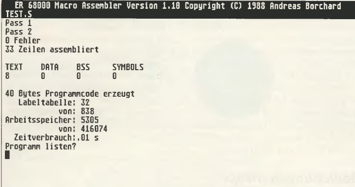 Das Handbuch bietet einen Schnellkursus für Lesefaule, der dem erfahrenen Programmierer ein sofortiges Arbeiten ermöglicht. Die Anleitung bietet alle wesentlichen Informationen und läßt kaum Fragen offen, die eist durch Ausprobieren beantwortet werden müssen. Die Formulierungen sind knapp aber präzise. Beispiele ergänzen die Erklärung. Wichtige Passagen sind durch Fettdruck hervorgehoben. Ebenso werden Spezialfalle und Klippen ausreichend behandelt. Vorausgesetzt werden Kenntnisse des 68000-Assemblers. da der Befehlssatz und die Adressierungsarten nur tabellarisch aufgelistet sind. Einzig die Gliederung ist manchmal etwas merkwürdig, so sind die Möglichkeiten der Shell über mehrere Kapitel verstreut. Hier wäre eine Zusammenfassung der Kommandozeilen-Svn-tax, Assembler-Aufrufmöglichkeiten und Editierfunktionen angebracht. Die Liste der Fehlermeldungen ist unsortiert, so daß man ein wenig suchen muß. Außerdem wäre es für Anfänger sicher hilfreich, wenn hier bei allen Meldungen einige Tips zur Behebung des Fehlers stünden.