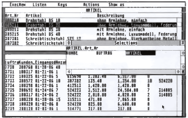 Bild 1 zeigt drei mit dem Listengenerator programmierte Listenfenster, die Daten einer Beispieldatenbank enthalten. Das oberste Fenster enthält die Namen der Dateien in einer horizontalen Liste, wobei das Anklicken einer Datei ein neues Listenfenster für den Inhalt der Datei öffnet. Im Hintergrund sehen Sie zwei solche Fenster.
