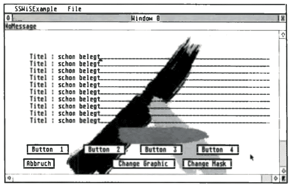 Der MaskManager ist also eine Sammlung von Funktionen, die die Maskenprogrammierung unterstützen. Vergleicht man die Masken mit den Standard-GEM-Formularen, so liegen seine Fähigkeiten etwa auf der Ebene des Form-Managers von GEM. Zur Verarbeitung von Benutzereingaben muß der Programmierer die SSWiS-Ebene benutzen und wird dabei sinnvoll von einigen Service-Routinen unterstützt. Für eine konkrete Anwendung wird man sich noch einige kleinere Funktionen hinzuprogrammieren müssen oder Prozedurrahmen aus den mitgelieferten Beispielprogrammen übernehmen.