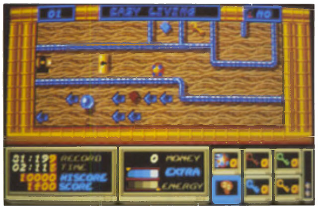 Damit ist schnell in Erfahrung zu bringen, wo Teleporter zu finden sind, die die Kugel an eine andere Stelle im Labyrinth beamen. Als schnelles Transportmittel bieten sich auch Röhren an. Sie saugen die Kugel vollautomatisch ans andere Ende der Röhre. Man sieht. Rock ‘n’ Roll steckt voller Details. Es gibt viele Extras, aber auch einen Haufen Elemente wie Ventilatoren (pusten die Kugel ganz gemein weg!) und Schalter, die man aktivieren muß. um Fallen zu umgehen. Bei Rock ‘n* Roll handelt es sich um eine nette Mischung aus Labyrinth, -Geschicklichkcits- und Strategiespiel, die in keiner Software-Sammlung fehlen sollte.