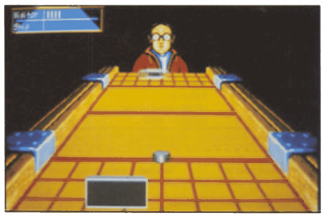 Bei Broderbunds neuem Wettkampfspielchen handelt es sich eigentlich um ein sehr simpel gestricktes Game. Trotzdem macht es wenigstens für einige Stunden Spaß. Shufflepuck Cafe ist ein Tischhockeyspiel, wie man es in vielen amerikanischen und kanadischen Kneipen antrifft. Zwei Kontrahenten sitzen sich an einem Tisch gegenüber, der an beiden Längsseiten durch Banden abgeschlossen wird. Jeder Spieler steuert einen Schläger, mit dem er den Puck auf die Seite des Gegners schießt. Der wiederum verhindert, daß das Geschoß auf seiner Seite durchgeht, und versucht, ihn zurückzupfeffern, um eventuell ein Tor zu erzielen. So einfach geht das. Neun verschiedene, ziemlich skurril aussehende Gegner stehen zur Auswahl. Einige davon sind sehr leicht zu schlagen, andere lassen sich nur mit viel Übung bezwingen. Entweder gibt man sich mit einer einzelnen Partie zufrieden, oder man wagt sich gar in den Tumiermodus. Damit das Shufflepuck Cafe nicht schon nach einigen Stunden total uninteressant wird, haben die Programmierer einige Extras eingebaut. Während einer Partie kann man durch Drücken der Space-Taste in einem Menü von zusätzlichen Optionen Gebrauch machen. Wem die Schläger nicht groß genug sind, der kann sie mit der Maus fast bis zur Bande verbreitern. Da kommt dann kaum noch ein Puck vorbei. Natürlich ist auch der umgekehrte Fall möglich. Geschrumpfte Schläger verschaffen dem Spiel einen zusätzlichen Reiz. Wer damit noch alle Pucks erwischen will, die angeschossen kommen. muß ganz schön flink sein. Neben der Veränderung des Schlägers gibt es noch eine weitere Möglichkeit, den Schwierigkeitsgrad zu erhöhen: In beliebiger Größe lassen sich sogenannte Blocker auf die Spielfeldmitte setzen. die den Puck des öfteren ziemlich gemein ablenken. Die Grafik von Shufflepuck Cafe geht in Ordnung. Dafür klingt der Sound, besonders die schrille Titelmelodie. ziemlich grauenhaft. Der Spielspaß hätte noch gesteigert werden können, hätten die Programmierer eine Zwei-Spieler-Option eingebaut.
