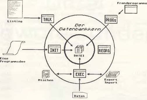 Im Vereinbarungsteil INIT legt der Benutzer die spĂ€tere Struktur der Datenbank fest. Dies geschieht noch in gewohnter GEM-Manier mit Maus, MenĂŒs und Symbolen. FĂŒr die spĂ€tere Arbeit in TALK steht auch das neue Merkmal âVerbĂŒndeâ zur VerfĂŒgung. In der l /EW-Funktion wird eine eigens erzeugte Verbundmaske benutzt, um nur bestimmte Datenbankfelder anzeigen zu lassen. Bei der JOIN-Funktion ist es sogar möglich, einzelne Felder aus verschiedenen Dateien in einer Maske zusammenzulegen und zu bearbeiten.
