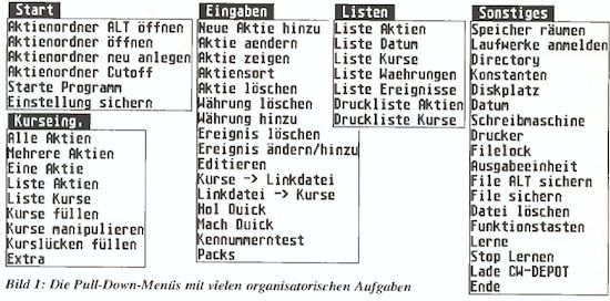 Der Eröffnungsbildschirm zeigt oben die ĂŒbliche MenĂŒleiste und am unteren Bildrand zwei Leisten fĂŒrdie Funktionstasten. Unter den Pull-Down-MenĂŒs verbergen sich (auf dieser Programmebene) zahlreiche Verwaltungsaufgaben wie Kurseingabe, Aktien anlegen, Listen ausgeben usw. Es wĂŒrde den Rahmen dieser Berichtserstattung sprengen, wenn all diese Feinheiten ErwĂ€hnung finden sollten. FĂŒr mein GefĂŒhl sind die Verwaltungs-Pull-Downs wirklich ein wenig reichlich mit âTĂ€tigkeitenâ angefĂŒllt, da hĂ€tte es doch sicher eine geschicktere Lösung gegeben.