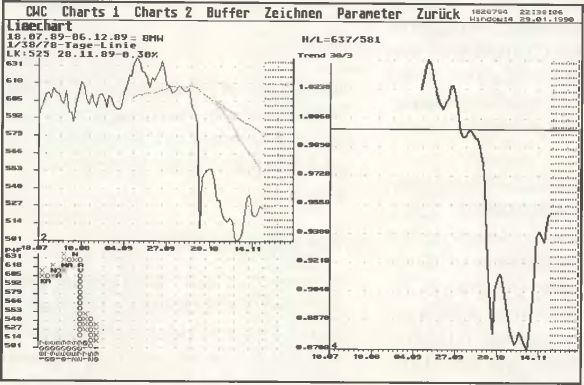 Jetzt wird die StĂ€rke von CW-CHART richtig deutlich: In den MenĂŒpunkten âCharts 1 â und âCharts 2" sind sage und schreibe 33 verschiedene grafische Darstellungsarten untergebracht - das ist eine wahre Fundgrube fĂŒr den Analytiker! So begegnen uns dort Begriffe (die in dem Grundlagenartikel von Heft 2/90 nĂ€her beschrieben wurden) wie Linie. Balken. Momentum. Point & Figure, High/Low. Aber auch eine Vielzahl von Tabellen ist hier zu finden.