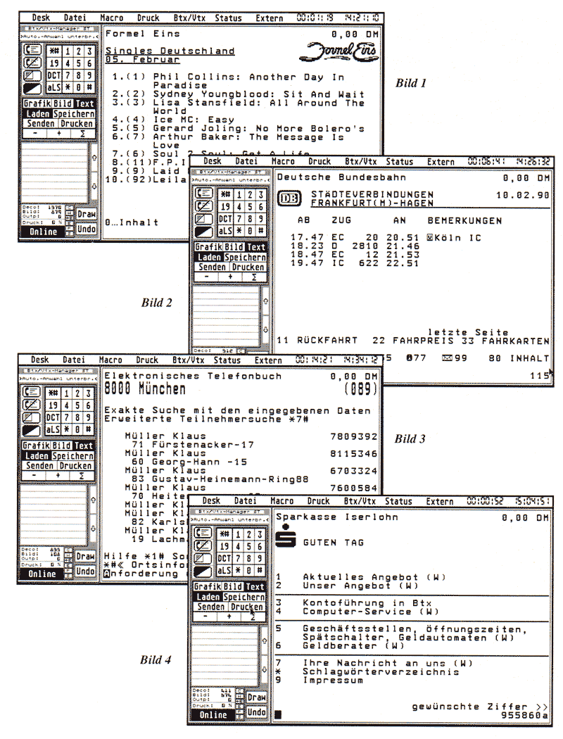 Natürlich sind nicht nur Bundesanstalten wie die Post oder die Bahn und Banken in Bildschirmtext vorhanden. Sie können beispielsweise auch (eingeschränkt) einkaufen, z.B. können Sie ein Abonnement beim Vogel-Verlag bestellen, sich in Eden (“*EDEN#”), der Stadt der Zukunft, herumtreiben (sofern Sie älter als 18 sind), beim Chaos Computer Club mitmischen (“*CCC#”), Nachrichten an den Reparaturdienst Rat & Tat oder an andere Benutzer des Bildschirmtextsystems schicken oder einfach Informationen wie die aktuellen Charts bei Formel 1 ansehen.