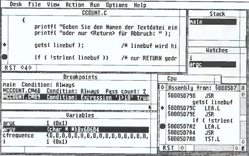 Natürlich ist Turbo C 2.0 ab sofort in der Lage, Debug-Informationen in den Code zu integrieren. Dazu gibt es die Y-Option beim Compiler und beim Linker. In der Shell ist (schon seit der Version 1.1) ein Menüpunkt vorhanden, der nach dem (eventuell nötigen) Compilieren automatisch den Debugger aufruft. Wer jetzt denkt, daß dabei automatisch das Y-Flag für Compiler und Linker gesetzt werden, hat weit gefehlt. Dadurch ist es mir nicht nur einmal passiert, daß ich mich nach geglücktem Compiler-Lauf im Debugger befand, der natürlich nichts besseres zu tun hatte, als eine Meldung auszugeben, der Code habe keine Debug-Information; selbst ein Compiler-Lauf, der mit Debug eingeleitet wurde, führt bei einem Link-Error trotzdem zum Aufruf des Debuggers...!?!? Ärgerlich ist auch, daß, wenn Flag-Einstellungen innerhalb der Shell geändert wurden (Beispiel: Y-Flag in Compiler und Linker eingeschaltet), die Make-Option dies nicht erkennt. Mit anderen Worten: Ist das Programm vorher schon einmal ohne Y-Einstellungen compiliert worden, weigert sich die Shell standhaft, mit MAKE neu zu compilieren. Sicherlich gibt es Fälle, bei denen man Debuggen will und Teile nicht mit Debug-Info versehen möchte - ich möchte aber behaupten, das sei der seltenere Fall. Ich hoffe, daß das automatische Setzen des Y-Flags bei DEBUG und das Erkennen von Änderungen von Optionen durch MAKE noch implementiert wird, denn die Shell soll ja Arbeit abnehmen! Man bedenke, daß man sonst eigentlich nicht viel an ihr aussetzen kann, denn fast alles läßt sich mit der Tastatur steuern (lobenswert!). Wenn da nicht der Editor wäre: Mir ist bewußt, daß ich ab diesem Moment alle GEM-Fans gegen mich habe, aber warum muß dieser Editor so langsam sein? Ich weiß, daß er ausschließlich mit GEM-Routinen programmiert ist und daher auf jeder Grafik laufen wird. Dies ist aber nur eine Vereinfachung der Programmierung von Borlands Seite. Ich als Anwender habe mit einem solchen Editor zu kämpfen. Ich gebe zu, daß man die unsaubere Programmierung übertreiben kann, aber trotzdem bin ich ein Anhänger kurzer Turn-Around-Zeiten, die mit diesem Editor auf gewisse Weise zunichte gemacht werden. Daß es auch anders geht, zeigen die Windows im Turbo-Debugger, die angenehm zu bedienen sind.
