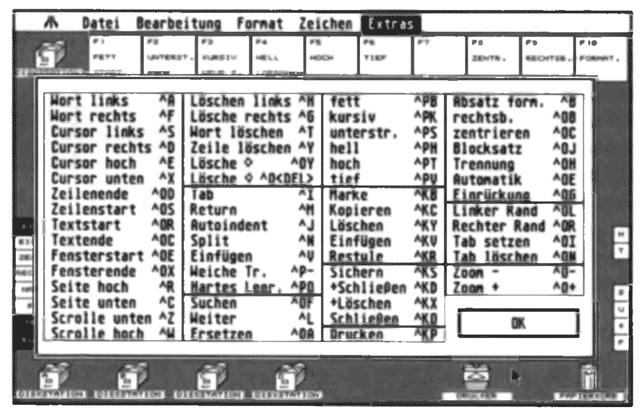 Die Ansteuerung von Kommandos ist auf drei Arten möglich. Auf der Tastatur sind natürlich die Sondertasten belegt. Weitere Kommandos liegen als Control-Codes vor, deren Belegung sich sehr stark am guten alten Wordstar orientiert (Bild 3). Die frei zu belegenden Funktionstasten können Kommandosequenzen auslösen.