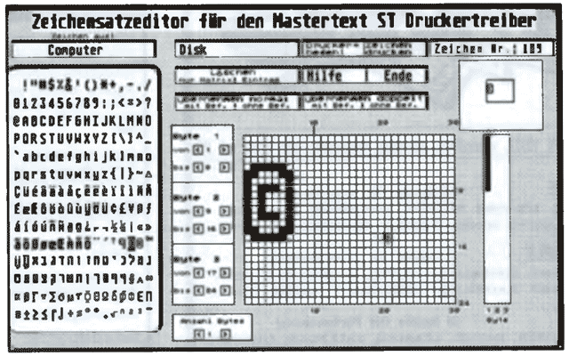 Neben den Steuersequenzen muß auch derZeichensatz angepaßt werden, da nicht alle Zeichen des ST auf allen Druckern vorhanden sind. Dazu läßt sich eine Umsetzungstabelle notieren, in der beispielsweise eine Zeile „ä = a\8,““ steht. MasterText gibt nun anstelle des französischen Akzents die Sequenz a, Backspace und den Akzent aus.