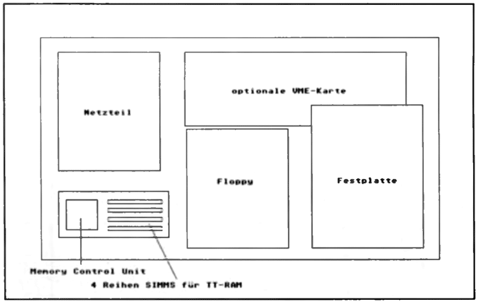 Im Gegensatz zum ATARI ST finden sich im TT verschiedene Arten von RAM, die auch unterschiedliche Behandlung erfordern. Bei der Programmierung muß man dies auf jeden Fall berücksichtigen. „Serienmäßig“ sind derzeit 2 MB RAM im TT enthalten, das ST-kompatibel ist, weshalb hier auch von ST-RAM gesprochen wird. Es kann vom Prozessor, für die Bildschirmdarstellung, ACSI-DMA und DMA-Sound genutzt werden und soll in Zukunft bis auf 4 MB erweiterbar sein. Der TT besitzt übrigens den gleichen PCM-Sound-Generator wie der STE, mit dem sich auch der neu integrierte Lautsprecher des TT softwaremäßig abschalten läßt.