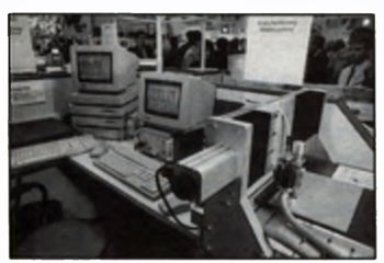 Bei Diplom-Ingenieur Praefeke war das Programm „PCB Layout“ zu begutachten. Es war an eine Ätzmaschine angeschlossen. Erstellte Platinen-Layouts können so innerhalb weniger Minuten schnell erstellt werden: Das Layout wird im Computer fertiggestellt und sofort auf die Ätzmaschine gegeben, die die Platine so erstellt, daß sie sofort benutzt werden kann. Das Programm kostet inklusive Ätzmaschine knapp DM 10.000,- und liegt damit im Gegensatz zu anderen professionellen Geräten dieser Art auf einem recht preiswerten Niveau. Weiterhin wurde hier das Programm „Malis“ vorgestellt, ein Programm für Malerbetriebe. Mit Malis ist es möglich, alle Schreibtischarbeiten, die ein Maler normalerweise durchzuführen hat, mit einem speziell auf Maler zugeschnittenen Programm zu erledigen. In der Software sind Aufmaßerfassung und -berechnung, Datenverwaltung. Angebotserstellung, Auftragsbestätigung. Arbeitszettel und Materialliste, Leistungskalkulation und Rechnungsschreibung enthalten.