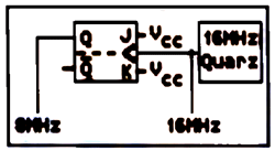 Uns haben mehrere Briefe zu diesem Thema erreicht, so daß wir dies hier noch einmal aufgreifen möchten. Wenn der 16 MHz-Takt für den Floppy-Controller, aus welchen Gründen auch immer, extern erzeugt werden muß, ist die Verwendung eines Quarzoszillators wohl die einfachste und eleganteste Lösung. Nun sollte auch der 8 MHz-Takt für den 'normalen' Betrieb des Controllers aus diesem abgeleitet werden. Das Prinzip dazu ist in Bild 1 zu sehen. Das vom Quarzoszillator kommende Signal wird auf den Takteingang eines JK-Flip-Flops gegeben. Seine Ausgange wechseln nun, bei der dargestellten Belegung der Eingänge |J und K liegen fest auf 1 (+5V)|, bei jeder fallenden Flanke des Taktsignals ihren Zustand. So erhält man am Ausgang ein Signal mit 8 MHz. Die Realisierung mit ICs ist in Bild 2 wiedergegeben. Für das Flip-Flop eignet sich sowohl der 74LS73 als auch der 74LSI03. Da diese beiden Bausteine eine unterschiedliche Pin-Belegung haben, sind beide angegeben (in Klammem die für den 74LS 103).