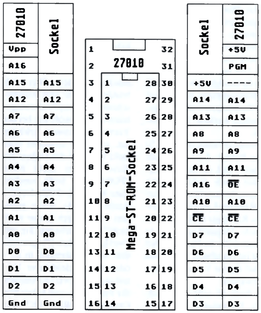 Will man das Betriebssystem in zwei EPROMs packen, werden Chips mit 128 kByte Speicherkapazität benötigt. Diese gibt es, mit ungebanktem (linearem) Adreßraum als Typ 27010. Leider besitzt dieser IC 32 Pins. Die Fassungen im ST sind aber nur für 28polige Bausteine vorgesehen. Diese Tatsache ist jedoch nicht weiter tragisch, vor allem, wenn man sich die Pinbelegung der Sockel und der EPROMs anschaut (Bild 1). Wie man sieht haben viele Pins die gleiche Bedeutung, so daß man die EPROMs fast direkt in die Sockel stecken könnte. Aber eben nur fast, ohne ein klein wenig Tüftelei kommt man nicht aus.