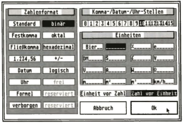 Ganz abgesehen davon stellt der verwendbare RAM-Speicher ebenfalls eine Grenze nach oben dar. Man muß sich gleich hier von der Illusion lösen, die theoretisch möglichen 676 Spalten nebeneinander und die 10.000 Zeilen untereinander alle vollständig und randvoll benutzen zu können. Selbst wenn in diesen 6.760.000 Zellen jeweils nur 1 Byte abgelegt wäre, würde dies selbst den Mammutspeicher eines MEGA-ST4 weit überschreiten.
