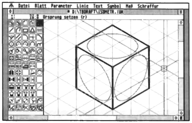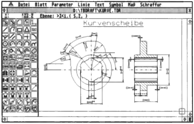 Die OberflĂ€che des Drafters ist ein wenig verĂ€ndert gegenĂŒber der des VorgĂ€ngers. Das Programm lĂ€uft jetzt komplett in einem GEM-Fenster, auch die Befehl-Icons befinden sich darin (siehe Bild I). Man braucht nicht mehr zwischen den Icon-Ebenen hin- und herzuschalten, es sind stĂ€ndig alle erreichbar. Das Fenster erlaubt den problemlosen Betrieb auf diversen Grafikkarten. Besonders interessant ist da die Farbgrafikkarte von MAXON, denn der Drafter beherrscht die Darstellung in 16 Farben. Das erleichtert die Arbeit natĂŒrlich ungemein, auch wenn die erforderlichen GerĂ€te kostenaufwendig sind.