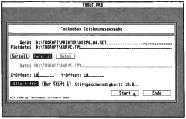 Das Ausgabekonzept des Drafters ist identisch mit dem von CAD/1 bekannten. Ein externes Ausgabeprogramm verarbeitet spezielle PLT-Dateien, die das Programm anlegt. Das Druckprogramm wiederum bedient sich verschiedener Treiber, um die GerÀte anzusprechen: Nadeldrucker, Laserdrucker, ATARI-Laser, PostScript und Plotter. Dabei sind verschiedene GerÀtetypen individuell anzupassen. Besonders die Plotter-Anpassung bietet Möglichkeiten, auch das exotischste GerÀt anzupassen. Das Programm selbst hat eine neue OberflÀche bekommen und ist nun komfortabel zu bedienen (siehe Bild 2). Leider besteht auf 24-Nadlern nur die Möglichkeit, in 180 mal 180 DPI auszugeben, also bei vielen GerÀten nur der halben maximalen QualitÀt.