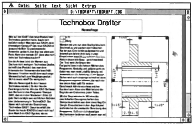 Das lĂ€Ăt sich aber mit einem Trick umgehen: Man exportiert die Zeichnung oder einen Teil daraus im GEM-Metafile-Format. DafĂŒr gibt es wiederum ein Zusatzprogramm. das - wie das Druckprogramm auch - direkt aus dem Hauptprogramm aufgerufen werden kann. Das entstandene Metafile importiert man in Calamus, was problemlos vonstatten geht und auf komfortable Art und Weise die Kombination von Text und Zeichnung ermöglicht (siehe Bild 3). Dieses Dokument wird anschlieĂend mit Calamus gedruckt und dann hat die Zeichnung die höchste QualitĂ€t. Doch GEM-bedingt leiden die Linientypen wie Strich-Punkt etc. darunter, denn die AbstĂ€nde werden viel zu gering.