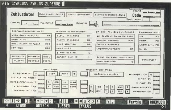Die Aufgabe des STs erstreckt sich nicht nur über das Sammeln der Personenstammdaten, sondern in bestimmten Zeitabständen schicken alle teilnehmenden Frauen Zyklusblätter ein, auf denen sie mit jeweils über 100 verschiedenen individuellen Zyklusdaten über Temperaturmessungen, Schleimbeobachtungen, Störungen usw. berichten. Das Programm zur Verarbeitung der Daten wurde von Dr. Bremme selbst geschrieben - er fand kein Programm, das die Problemstellung hätte adäquat lösen können. Inzwischen ist das Programm bereits so weit fortgeschritten, daß es zu einem umfangreichen, komfortablen, relationalen Datenbanksystem geworden ist und in erweiterter Form bald vertrieben werden soll. In der Schnelligkeit, dem Komfort und der Leistungsfähigkeit schlägt es viele andere Programme um Längen. Die Kommentare der Bediener sind einhellig positiv.