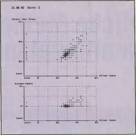 Alle eingehenden Daten werden vom ST verarbeitet. So können auch Problemstellungen wie “Korrelation zwischen Alter der Frau und mittlerer Zykluslänge” grafisch dargestellt werden, oder man erhält Datenmaterial über “alle katholischen Frauen über 25 mit einem bis zu 30 Jahre alten Mann, höchstens 2 Kindern und mindestens 12 Zyklusblättern”. Dabei entstehen dann solche Tabellen wie in Bild 2, die für wissenschaftliche Auswertungen hervorragend herangezogen werden können.