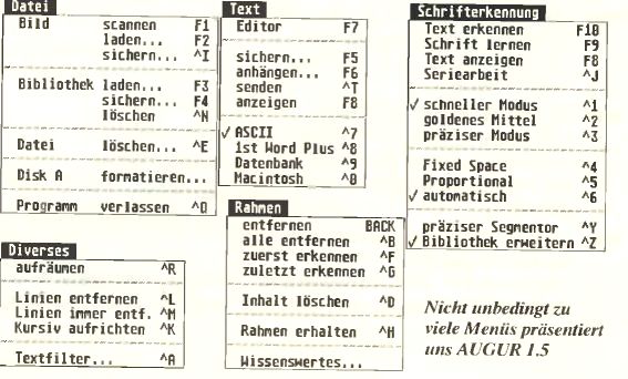 AUGUR 1.5 benötigt nach dem Starten nur noch 400 kByte Hauptspeicher und kann somit erstmals auch auf „kleineren“ STs wie dem ATARI 520 arbeiten. Wenn der Arbeitsspeicher fürdie Texterkennung selbst nicht ausreicht, wählt AUGUR einfach kleinere Bildausschnitte. Für ein sinnvolles Arbeiten mit einem Flachbett-Scanner ist aber auf jeden Fall ein Arbeitsspeicher von 2 MByte empfohlen.