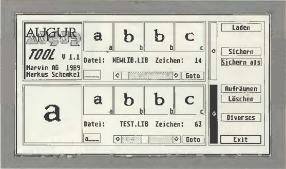 Jetzt ist das Löschen, Importieren, Vertauschen und Verketten verschiedener Bibliotheken leichter möglich. Besonders wenn mehrere Schriftbibliotheken zu derselben Typart existieren, können sie zu einer zusammengelegt werden. So war es in der Praxis oft vorgekommen, daß aus ein und derselben Textvorlage durch Änderung von Scan-Parametern (Helligkeit, Kontrast, Auflösung usw.) verschiedene Buchstabendefinitionen entstanden. Diese können nun mit AUGUR TOOL vereinheitlicht werden. Es kann wahlweise al s normales Programm oder als Accessory aufgerufen werden und benötigt nur 300 KByte Arbeitsspeicher.