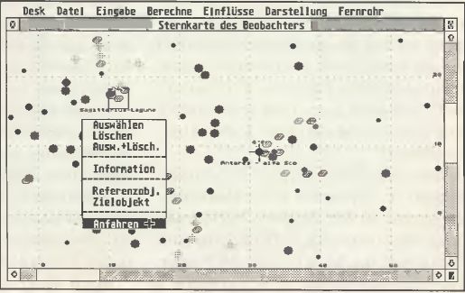 Nun muß einmal zu Beginn der Beobachtung das Fernrohr auf ein leicht zu identifizierendes Objekt (einen hellen Stern etwa) eingestellt werden. Dieses Objekt wird auf dem Atari-Bildschirm angeklickt und über ein Pop-Up-Menü als Referenzobjekt gekennzeichnet. Alles weitere ist ein "Kinderspiel". Das Objekt, das beobachtet werden soll, wird ebenfalls angeklickt und über das Pop-Up-Menü als Zielobjekt bekanntgemacht. Auf dem Bildschirm sind nun die beiden Objekte durch ein Fadenkreuz bzw. durch einen quadratischen Rahmen hervorgehoben. Mit der rechten Maustaste wird das Pop-Up-Menü aufgerufen und der Menüpunkt Anfahren angeklickt (siehe Bild).