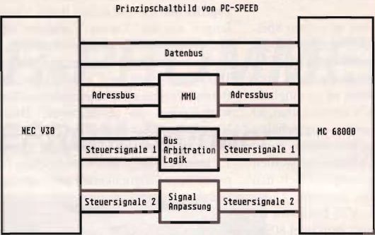 Um beide Prozessoren im selben Speicher arbeiten zu lassen, wurde die sogenannte Bus-Arbitration benutzt. Der 68000 wie auch der V30 verfügen über diese Möglichkeit. Dabei ist es möglich, einen Prozessor einfach abzuschalten, so daß ein andere, der soeben angeschaltet wurde, im System Weiterarbeiten kann. Durch die PC-SPEED-Hardware werden die Signale des V30 so umgewandelt, daß sie denen des 68000 gleichen. Diese Umwandlung ist beim V30-Prozessor im Gegensatz zum Original, dem Intel 8086, recht einfach. Zusätzlich ist in einem GAL ein MMU integriert, welches den Adreßbereich des V30 in einen geeigneten im ST abbildet. An der Adresse 0-$200 im ST liegen z.B. Interrupt-Vektoren für den 68000, die der V30 bei einer direkten Adreßanpassung verändern würde. Ebenso sorgt die MMU dafür, daß auch bei einem ST mit nur 512 kByte der ROM-Bereich ($F000:0000) und der Videospeicher ($B800:0000 bei CGA) für den V30 belegt sind. Auch wird das ROM des PC
