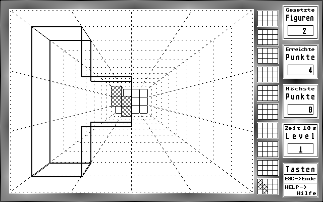 Die wie beim normalen TETRIS ebenfalls aus vier Segmenten bestehenden Figuren erscheinen am Bildschirm als durchsichtiges Drahtmodell. Über den CursorBlock und in Kombination mit der Shift-Taste lassen sie sich wie gewohnt verschieben, aber zusätzlich auch um sämtliche räumlichen Achsen drehen. Mit der Leertaste kann man die Steine in den Schacht fallen lassen. Auch wenn die Steuerung zunächst sehr kompliziert aussieht, sollte man sich davon nicht abschrecken lassen. Schon nach wenigen Runden hat sich die durchaus sinnvolle Tastenbelegung soweit eingeprägt, daß man sich voll auf das Spiel konzentrieren kann. Wie beim Vorbild besteht der Sinn des Spieles darin, die einzelnen Figuren in dem Schacht so anzuordnen, daß sie eine geschlossene Fläche bilden, die dann verschwindet. Schafft man dies nicht, wächst der Turm immer weiter, und mit Erreichen der obersten Ebene endet das Spiel.