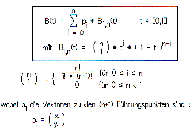 Die Definition der B(i,n) in Abbildung 1 zeigt, daß jeder Führungspunkt pi für alle t aus [0,1] Einfluß auf den Verlauf der Kurve hat. Daraus folgt, daß jeder Punkt der Bézierkurve von allen Führungspunkten abhängt, und die Kurve nicht durch ihre Führungspunkte gehen muß.