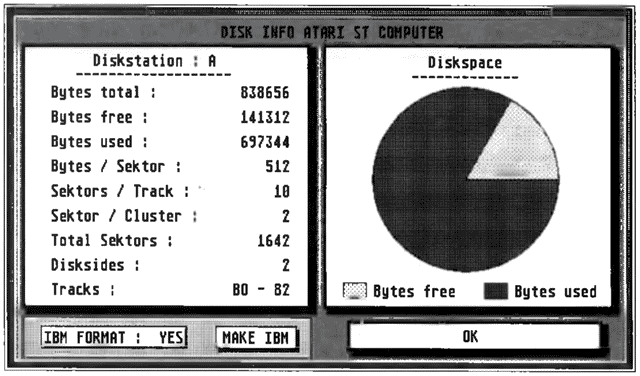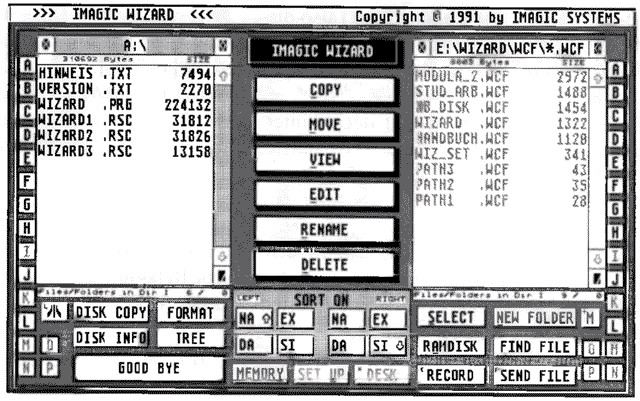 So quasi als Voraussetzung für alles weitere verfügt IMAGIC WIZARD über alle Grundfunktionenen für den Umgang mit Dateien, die jedermann vom Desktop her bekannt sind. Jedoch erinnern vereinzelt nur noch die Namen an diesen alten Meister. So ist das Formatieren von Disketten (auf Wunsch auch im MS-DOS-Format) ebenso möglich, wie eine hübsche grafische Darstellung von Laufwerksinformationen. Dateien können verschoben und ediert werden (Fremdeditor erforderlich), Ordner lassen sich im aktiven, wie im passiven Dateifenster erstellen. W eit über das übliche Umbenennen von Dateien geht „Rename“ hinaus. Hiermit lassen sich so gar Gruppenumbenennungen (zB. alle *.ACC in *.ACX) durchführen. Auch „DiskCopy“ fehlt als Funktion nicht, je doch ist es bedauerlich aber verschmerz bar, daß Disketten mit 11 Sektoren nicht kopiert werden können.