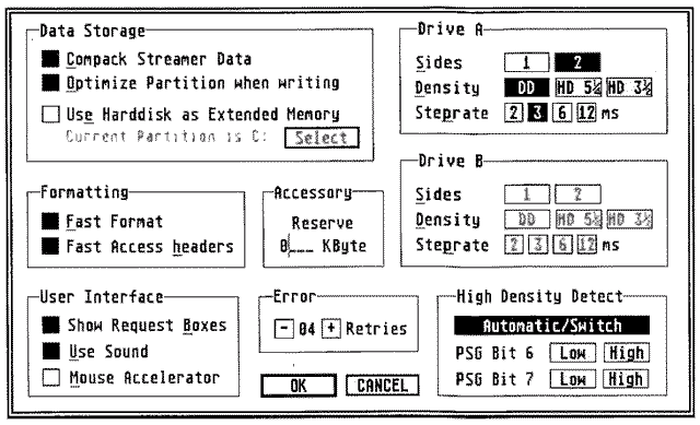 Bei FCopy handelt es sich um ein Kopierprogramm, das in erster Linie für das Arbeiten mit Floppies gedacht ist. Solche diskettenorientierten Programme müssen mit möglichst vielen Diskettenformaten zurechtkommen, um einen universellen Einsatz sicherzustellen. So bietet FCopy nicht nur die Möglichkeit, Standarddisketten zu formatieren oder zu kopieren, sondern auch viele andere Formate zu bearbeiten. Hierzu zählen auch Disketten, die mit mehr als den üblichen 80 Spuren und 9 Sektoren pro Spur formatiert sind. Neben Disketten doppelter Dichte, wie sie auf ST und TT standardmäßig verwendet werden, ist FCopy in der Lage, unter Verwendung eines geeigneten Laufwerks High-Density-Disketten zu lesen und zu beschreiben. Für den Einsatz von HD-Disketten benötigen die STs ein Umrüst-Kit, das von verschiedenen Anbietern erhältlich ist. Der TT kommt ohne Eingriffe ins Gerät mit HD-Laufwerken zurecht. Zwar geht die Programmbeschreibung zu FCopy in diesem Punkt nicht weiter auf den TT ein, eigene Experimente zeigten jedoch, daß FCopy auch auf diesem Rechner zum Bearbeiten von HD-Disketten eingesetzt werden kann.