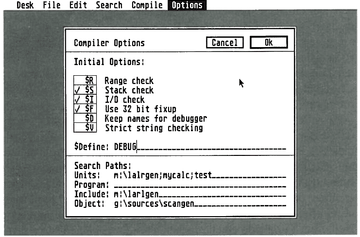 Da der Compiler zu Turbo-Pascal so kompatibel sein sollte wie nur möglich, ist es nur verständlich, daß man oft auf wohlbekannte Features stößt. Die meisten Compiler-Direktiven zum Beispiel sind auch übernommen worden. Sie ermöglichen es dem Programmierer, den Compiler aus dem Programm heraus zu steuern. Unter anderem hat man somit einen vollständigen, C-ähnlichen Präprozessor implementiert, der bedingte Compilierung unter Pascal ermöglicht. Außer den aus C bekannten Befehlen define, ifdef usw. gibt es auch ifopt. Mit dieser Direktive kann man Optionen. die in dem Optionen-Menü oder über die Direktiven gesetzt wurden, überprüfen. Das wären zum Beispiel alle Bereichsüberprüfungen. Auch include ist implementiert und ermöglicht das Einbinden von Quelltexten zur Übersetzungszeit. Daneben kann man auch DRI-Objektcode anderer Compiler und Assembler einbinden.