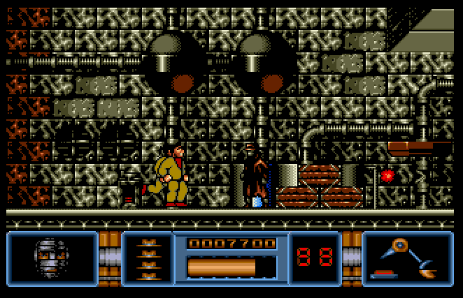 Alle ĂŒberwĂ€ltigten Gangster verlieren kleine Pakete, die der Spieler aufsammeln sollte. Sie geben ihm einiges der verbrauchten Kraftreserven zurĂŒck. Am Ende dieses Levels trifft man auf âDurantâ, dessen Aktentasche mit Geldinhalt man sich aneignen muĂ. Danach findet man sich als Gefangener in einer Fabrik wieder. In einer an âRobo-Copâ erinnernden Umgebung heiĂt es nun, weitere Bösewichter zu eliminieren und, wie bei einem guten Plattformspiel auf verschiedenen Ebenen, ĂŒber bewegliche Rampen und auf Leitern bis zum Dach vorzudringen. Dort versucht âDurantâ, mit einem Helikopter zu flĂŒchten. Wagemutig hĂ€ngt man sich an das Seil, das vom Hubschrauber herabhĂ€ngt. NatĂŒrlich versucht der Schurke, die unfreiwillige Last am Seil loszuwerden, und man braucht sehr viel Geschick, um diese Situation heil zu ĂŒberstehen. Ist dies geschafft, folgt das groĂe farbenprĂ€chtige Finale, dessen Einzelheiten wir hier nicht vorwegnehmen wollen.