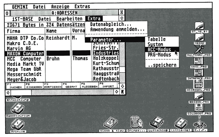 Im Unterschied zu 1st Address stellt 1st Base nun auch ein eigenes Desktop dar, das mit Papierkorb, Icons für die jeweilige geladene Datenbank und die von 1ST-Word her bekannten Funktionstasten-Buttons bestückt ist. Wird das Programm als Accessory geladen, befindet sich dieses Desktop komplett in einem GEM-Fenster, was natürlich zu lasten der Darstellung der eigentlichen Datensätze geht. Deswegen lassen sich im Accessory-Modus die Desktop-Symbole und die Funktionstasten-Buttons ausblenden. Erstaunlich ist, daß auch die Pull-Down-Menüs weiterhin verfügbar sind. Sie befinden sich ebenfalls mit in dem GEM-Fenster. Durch diesen Trick gibt es quasi keinerlei Beschränkung in der Bedienung des Programmes hinsichtlich einer Installation als Accessory. Diese Art zu programmieren, sollte in Zukunft Schule machen, auch oder gerade im Hinblick auf Multitasking.