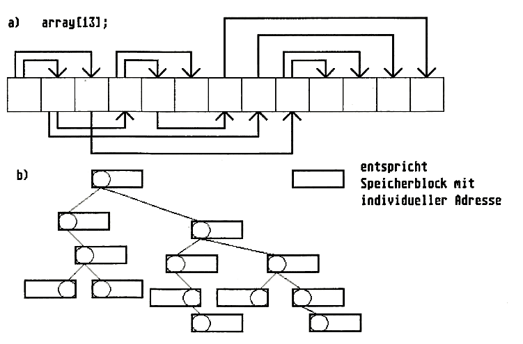 HĂ€ufig werden sie in arrays gepflanzt (Bild 2a). So z.B. die GEM-Resourcen von Programmen, die mit dem Resource-Construction-Set erstellt wurden. (Anmerkung: Ein Objekt in der Resource ist kleiner als das andere, wenn es sich grafisch gesehen innerhalb des anderen befindet.) Solche BĂ€ume wachsen in einem festen Beet und können somit eine bestimmte GröĂe, respektive die Anzahl der Verzweigungen nicht ĂŒberschreiten. Viel schöner, aber auch aufwendiger zu pflegen, sind die dynamischen BĂ€ume (Bild 2b), deren GröĂe von vornherein nicht feststeht, und die zur Laufzeit aufgebaut werden. Und mit diesen werden wir uns hier nĂ€her beschĂ€ftigen.