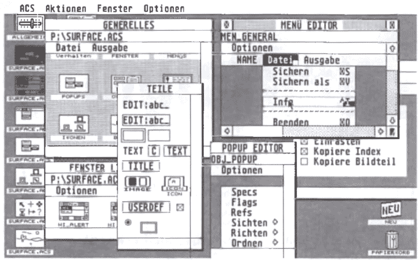 Mit dem neuen Application Construction System, kurz ACS, lassen sich vollständige GEM-Programme in kürzester Zeit erstellen. Es übernimmt dabei lästige Routineprogrammieraufgaben wie z.B. Neuzeichnen von Fenstern, Verschiebeoperationen etc. Mit dem ACS kann sich der Anwender voll und ganz auf seine Anwendung konzentrieren. Er muß lediglich definieren, welche Routinen bei Anwählen von Buttons, Icons etc. auszuführen sind. Das ACS besteht aus einem komfortablen Editor, der u.a. den Funktionsumfang eines RCS und eines Icon-und Image-Editors enthält. RCS-Dateien können weiterverarbeitet werden. Derzeit unterstützt ACS Pure C und Turbo C. Weitere Sprachen wie z. B. MAXON Pascal sind in Vorbereitung. ACS läuft auf ST, STE und TT und wird ab Anfang Dezember für DM 198,- erhältlich sein.